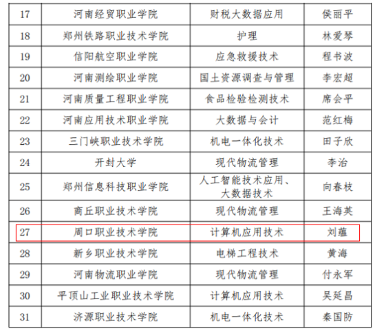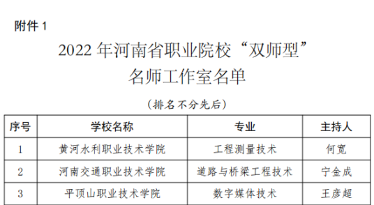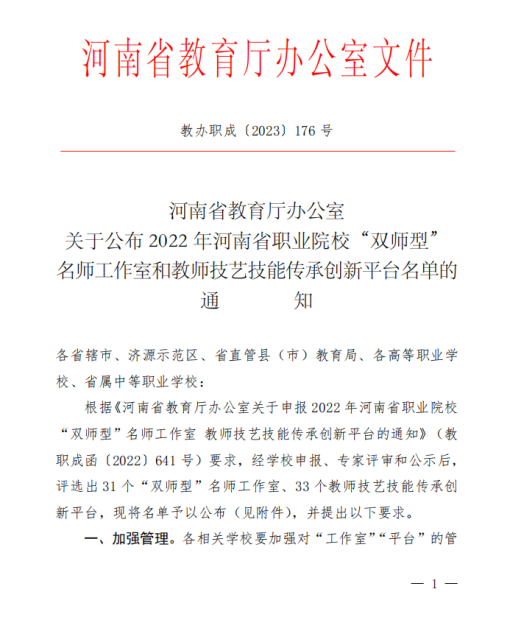 近日,河南省教育厅办公室印发了《河南省教育厅办公室关于公布2022年河南省职业院校“双师型”名师工作室和教师技艺技能传承创新平台名单的通知》(教办职成[2023]176号),我校A级毛片视频国产精品视频刘蕴教授作为主持人申报的计算机应用技术专业“双师型”名师工作室成功获批,这是我校“双师型”教师团队建设取得的又一重大成果。