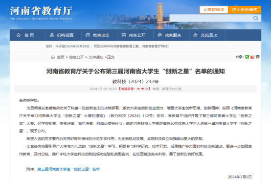 近日,河南省教育厅公布第三届河南省大学生“创新之星”获奖名单,我院22级计算机网络技术(2)班学生任俊臣被授予第三届河南省大学生“创新之星”荣誉称号,这是A级毛片视频国产精品视频学生首次获此殊荣。