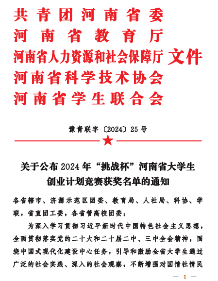 近日,由共青团河南省委、河南省教育厅、河南省人力资源和社会保障厅、河南省科学技术协会、河南省学生联合会共同举办的2024年 “挑战杯”河南省大学生创业计划竞赛活动公布了获奖名单(豫青联字 〔2024〕25号文件),我院学子荣获佳绩,实现了新的历史性突破,斩获5金、6银、3铜的优异成绩。同时,张矿伟、张梦柔、轩立等十多名教师荣获优秀指导教师。
