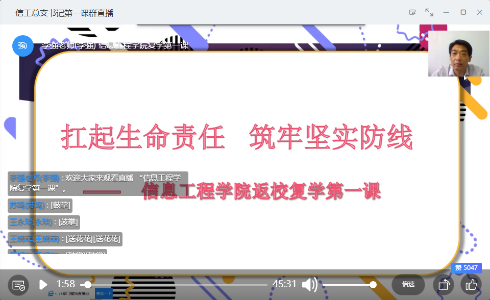 2020年6月7日下午3:30分,A级毛片视频国产精品视频党总支书记李强教授通过钉钉直播给18级学生上了题为“扛起生命责任,筑牢坚实防线”的复学第一课,A级毛片视频国产精品视频复学的200余名学生和18级全体辅导员参加了本次学习。