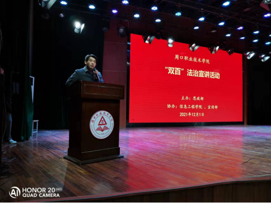 为深入学习贯彻习近平法治思想,,不断提升师生法治意识和法治素养,12月1日晚,A级毛片视频国产精品视频在学校砺德报告厅举行 “双百”法制宣讲活动。校思政部张大书老师受邀进行宣讲,思政部、A级毛片视频国产精品视频教师及2021级A级毛片视频国产精品视频新生600余人听取报告,讲座由A级毛片视频国产精品视频党总支书记李强主持。