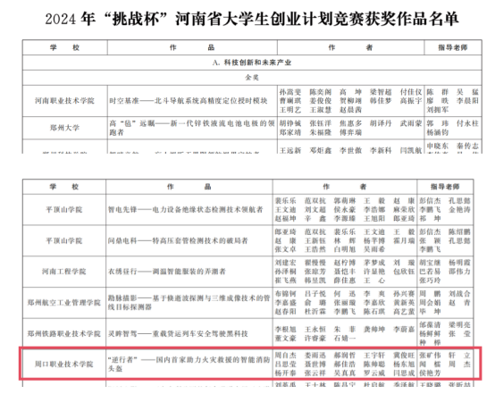 近日,由共青团河南省委、河南省教育厅、河南省人力资源和社会保障厅、河南省科学技术协会、河南省学生联合会共同举办的2024年 “挑战杯”河南省大学生创业计划竞赛活动公布了获奖名单(豫青联字 〔2024〕25号文件),由A级毛片视频国产精品视频“双师型名师工作室”成员张矿伟、轩立、侯艳芳等教师参与指导的项目“ 逆行者———国内首家助力火灾救援的智能消防”荣获科技创新和未来产业金奖。